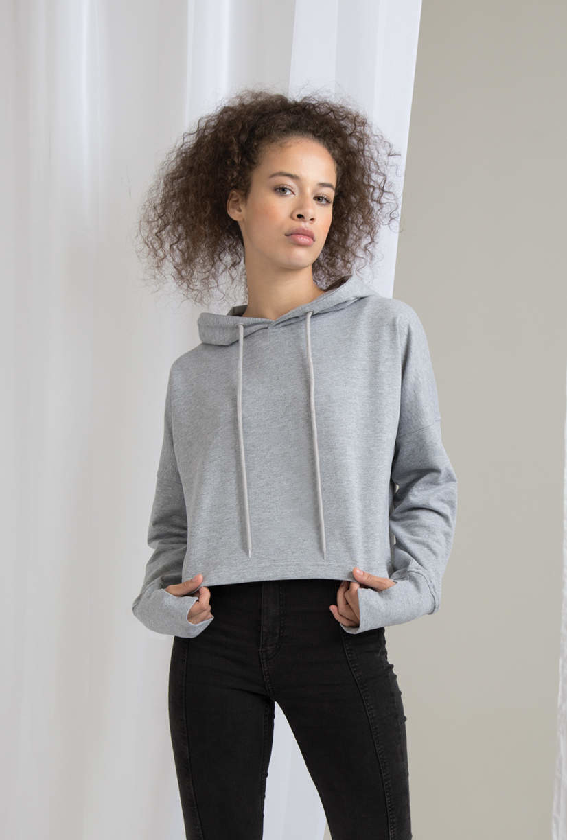 Legerer Schnitt | Kurz geschnitten| French Terry aus Biobaumwolle und rPET (= recyceltes PET (z.B. recycelte Plastikflaschen, etc.)) | Tief angesetzte Ärmel | Extralange Bündchen mit Daumenloch | Extralange Kordeln | 3-teilige, einlagige Kapuze | Abreißbares Etikett | Öko-Tex® Standard 100 und OCS zertifiziert